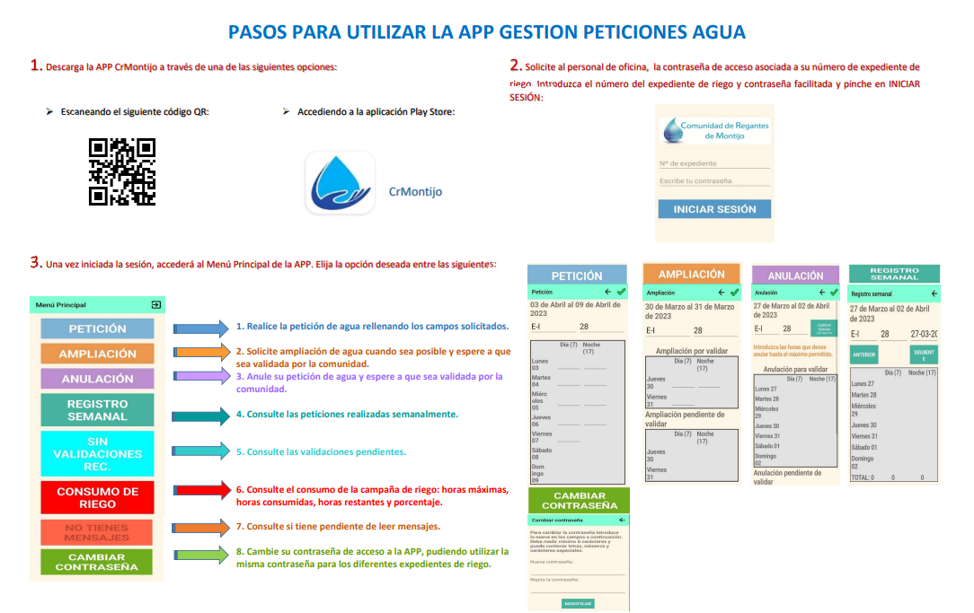 En este espacio podrás acceder o descargar la nueva APP de gestión de tus expedientes de riego. Desde ella, además de realizar las peticiones, ampliaciones y anulaciones, recibiás directamente las comunicaciones que la Comunidad quiera hacer llegar al regante e informate de las ultimas noticias de relevancia.